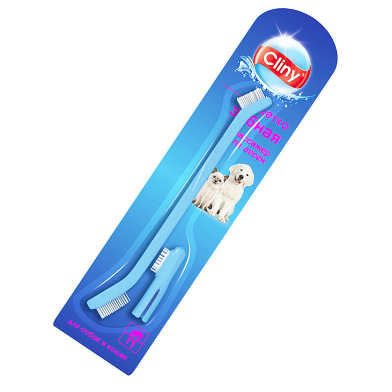 Cliny Зубна щітка для тварин з масажером для ясен. Повна довжина - 22 см. Довжина меншої щітки - 1,5 см. Довжина більшої щітки - 2,5 см. Довжина масажера - 6 см.